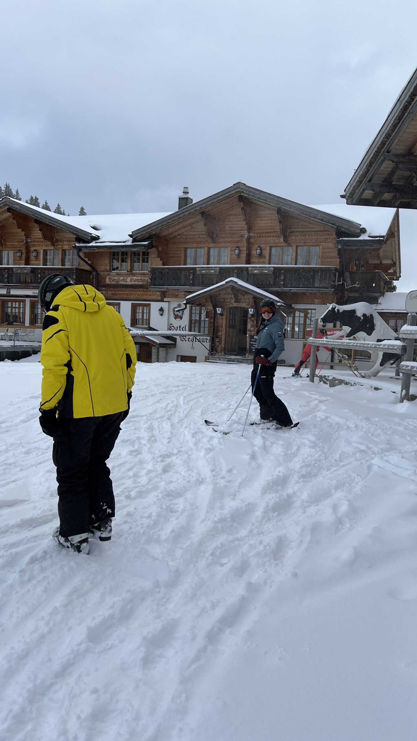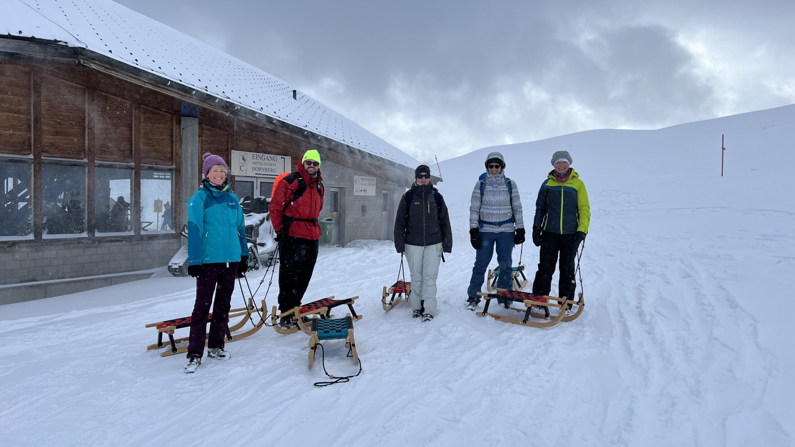 In diesem Jahr haben wir uns auf verschiedene Wintersportarten verteilt. Ein Teil der Gruppe machte die Piste auf Ski unsicher, ein anderer wollte zu Fuss zum Berghotel Hornfluh wandern. Schlitteln sollte am Samstag eine dritte Option sein.