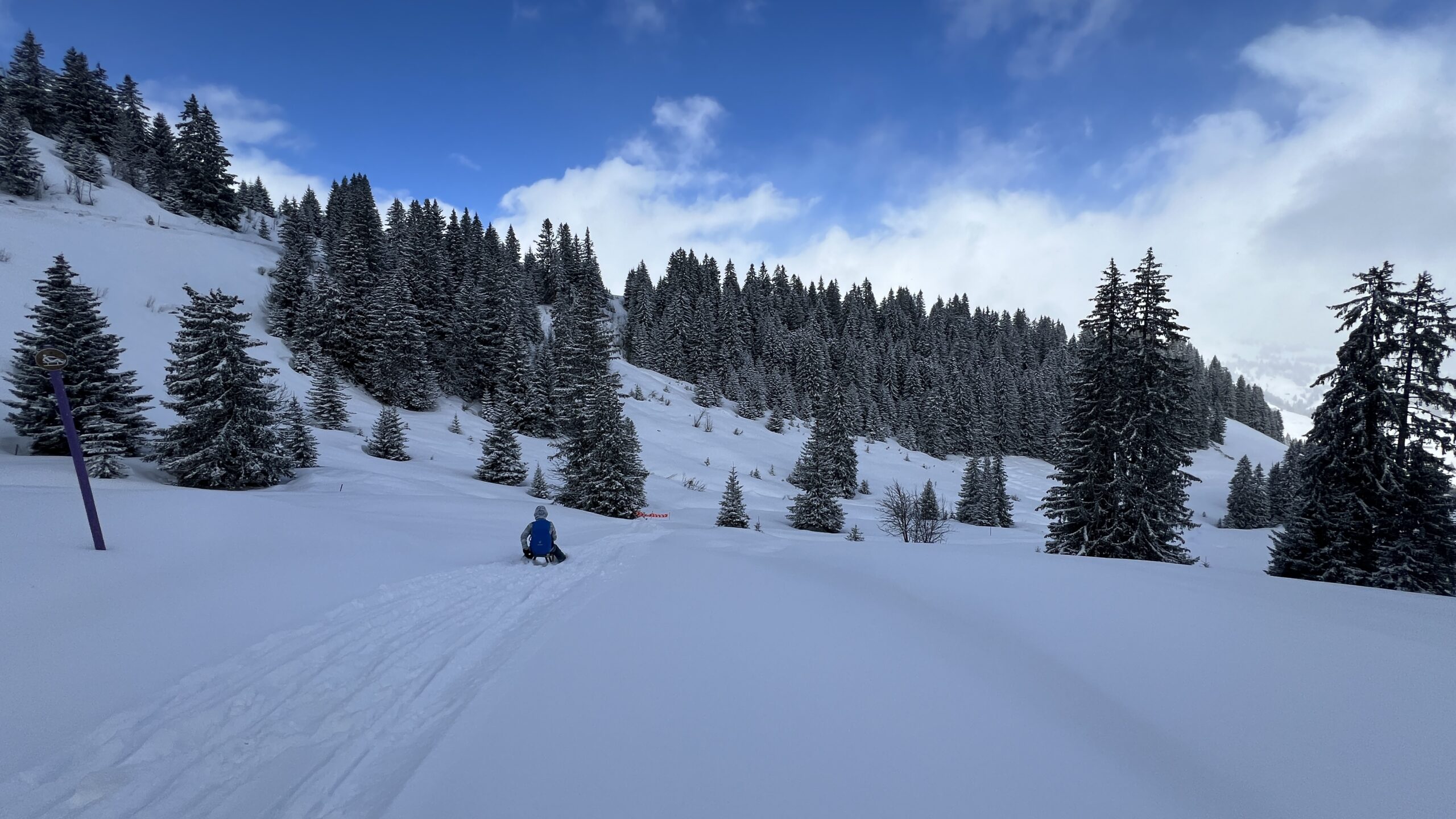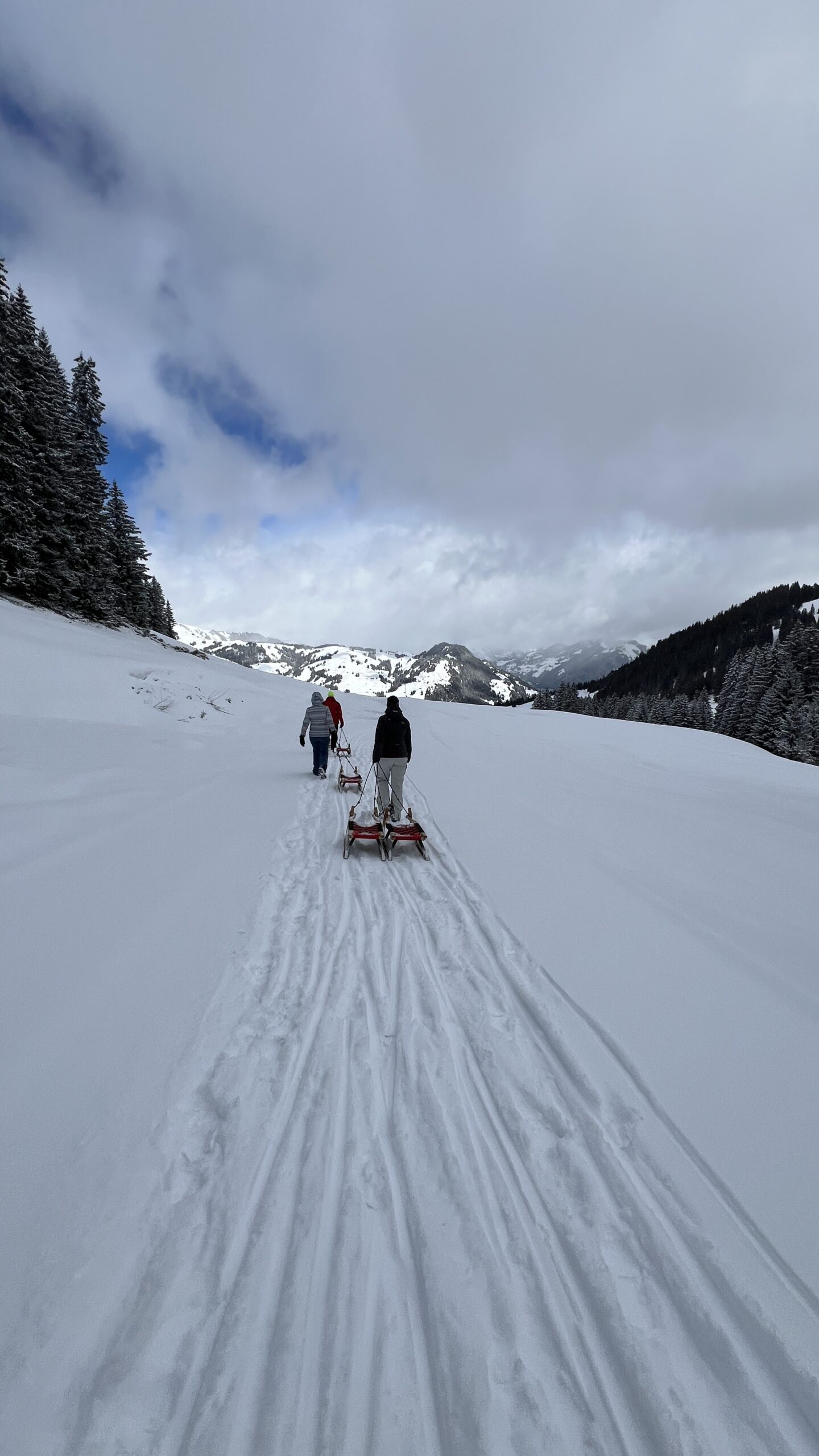 Am Sonntag dann die erhoffte Wetterbesserung: in der Nacht und auch am Morgen schneite es genug, das Skifahren und Schlitteln wieder möglich waren. Nach dem Frühstück ging es dann auch gleich nach draussen in den Neuschnee. Mit viel guter Laune pilgerten wir zur Bergstation. Jean-Claude hatte uns per Telefon Schlitten organisiert. Salome und Pierre blieben bei den Ski und Carmen, Michi, Marie, Regula, Evi und Nico erkundeten die frisch beschneite Schlittelpiste.