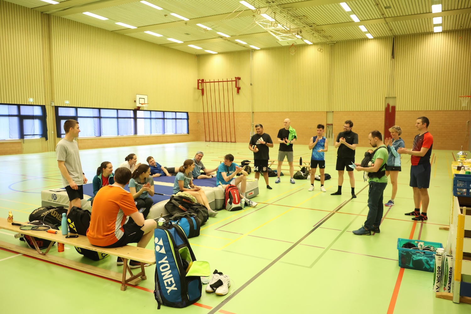 Nach dem Eltern-Junioren-Turnier, fand am Samstag, 12.04.2025, auch unsere Clubmeisterschaft statt. 4 Damen und 10 Herren hatten sich angemeldet und wollten mit viel Einsatz ein paar Shuttle schlagen. Bei dieser Gelegenheit zog es sogar Clubmitglieder für einem Moment aufs Feld, die den Schläger schon fast an den Nagel gehängt hatten oder nur noch als Trainer im Einsatz sind.