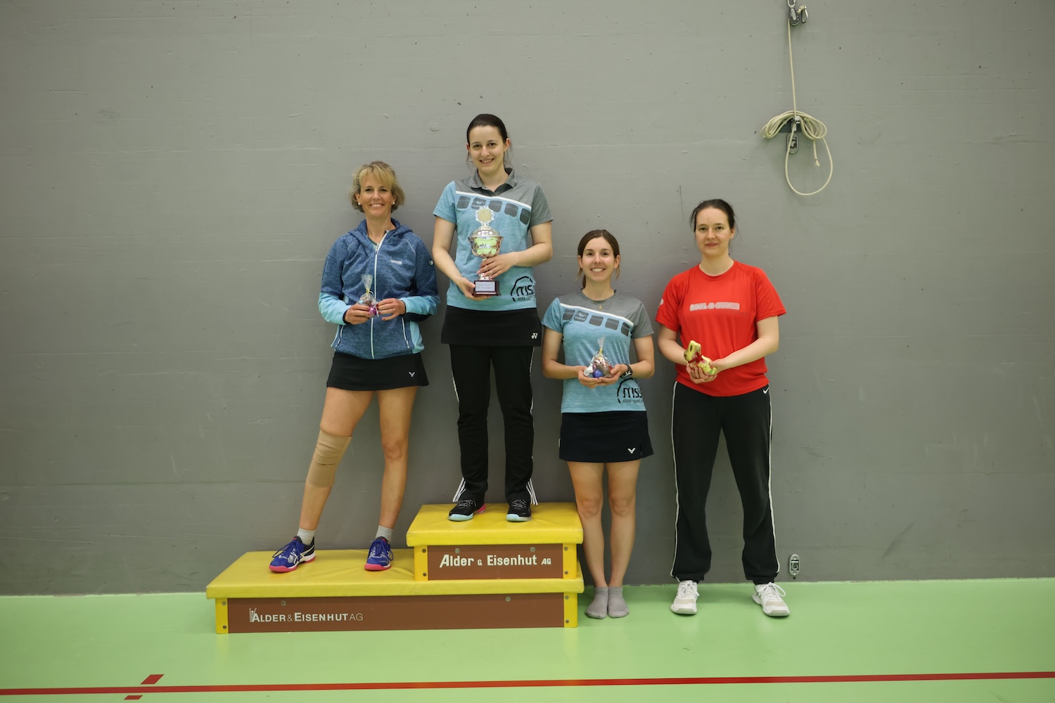 Sean und Marie die den jeweils letzten Platz bei den Herren bzw. Damen belegten, dabei aber mit viel Motivation, Spass und Energie bei den Matches dabei waren, bekamen als Trostpreis einen grossen Schokoladenhasen, den sie geniessen durften.