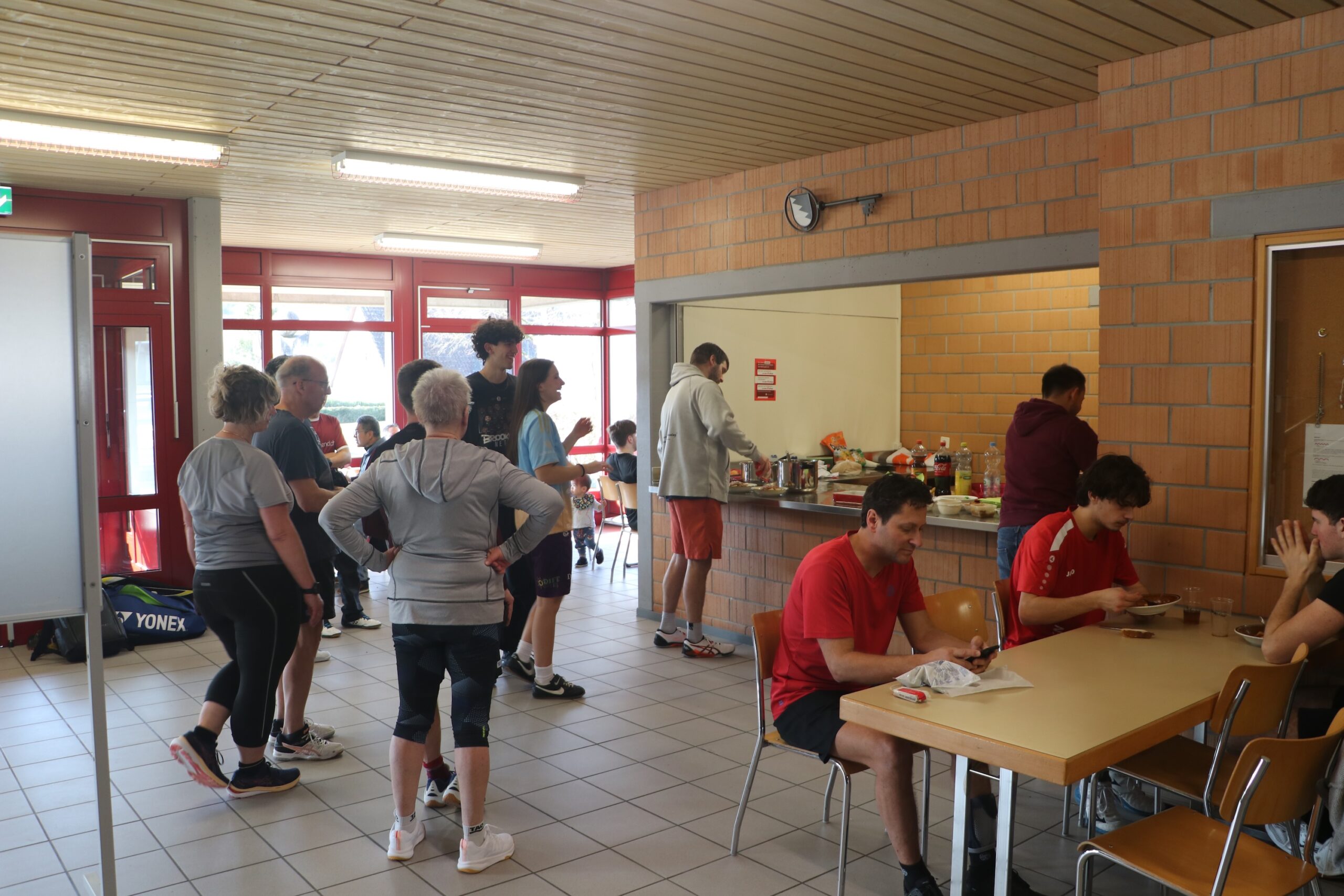Nach drei Runden und vielen tollen Ballwechseln, machte sich ganz langsam der grosse Hunger bemerkbar. Unser Küchenteam, Sarah, Sabrina und Marcel, war im Hintergrund schon fleissig und bereitete die Verpflegung der Spieler vor. Diese konnten sich über Nudeln mit verschiedenen Saucen freuen und so wieder Kraft tanken für die letzte anstehende Runde. In der Küche musste dieses Jahr sogar eine zweite Kochrunde eingelegt werden und auch von den Saucen war kaum noch etwas übrig. Das Mittagessen hat allen sichtbar geschmeckt. Ein grosses Danke an dieser Stelle, an unsere Köche 🙂