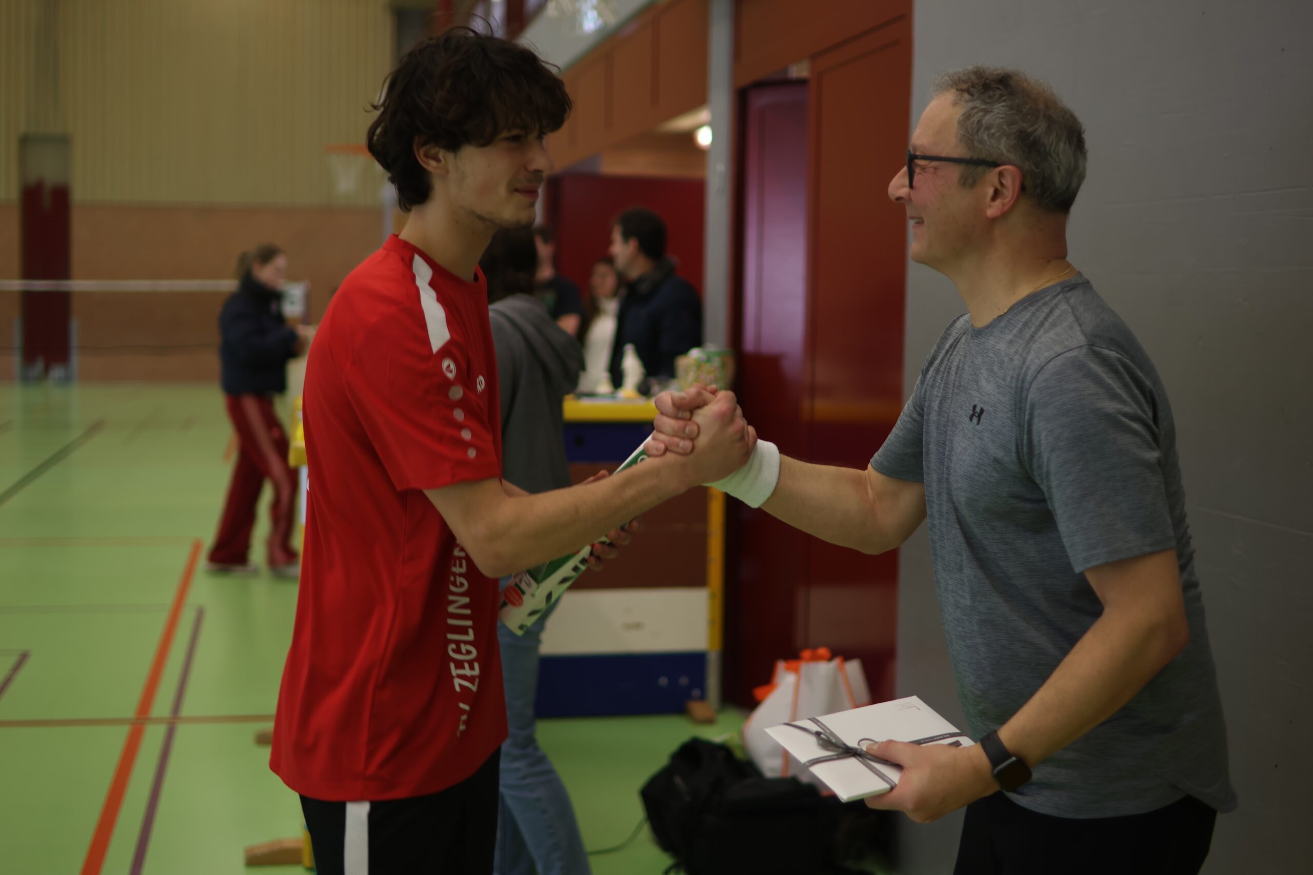 Nach einer kurzen Erholungspause für unsere Finalisten, ging es dann auch gleich zur Siegerehrung. Unsere Finalgewinner durften sich über einen Gutschein des Hotel Bad Bubendorf und einen goldenen Badminton-Anhänger freuen. Die jeweils zweitplatzierten erhielten eine Shuttle-Röhre mit silbernem Anhänger und auch die übrigen Plätze gingen nicht leer aus. Jeder Teilnehmer durfte sich ein kleines Souvenir in verschiedenen Farben aussuchen und so eine Erinnerung mit nach Hause nehmen.