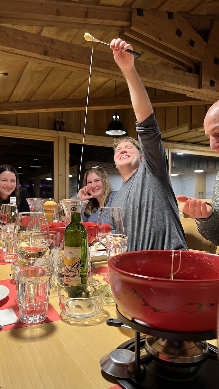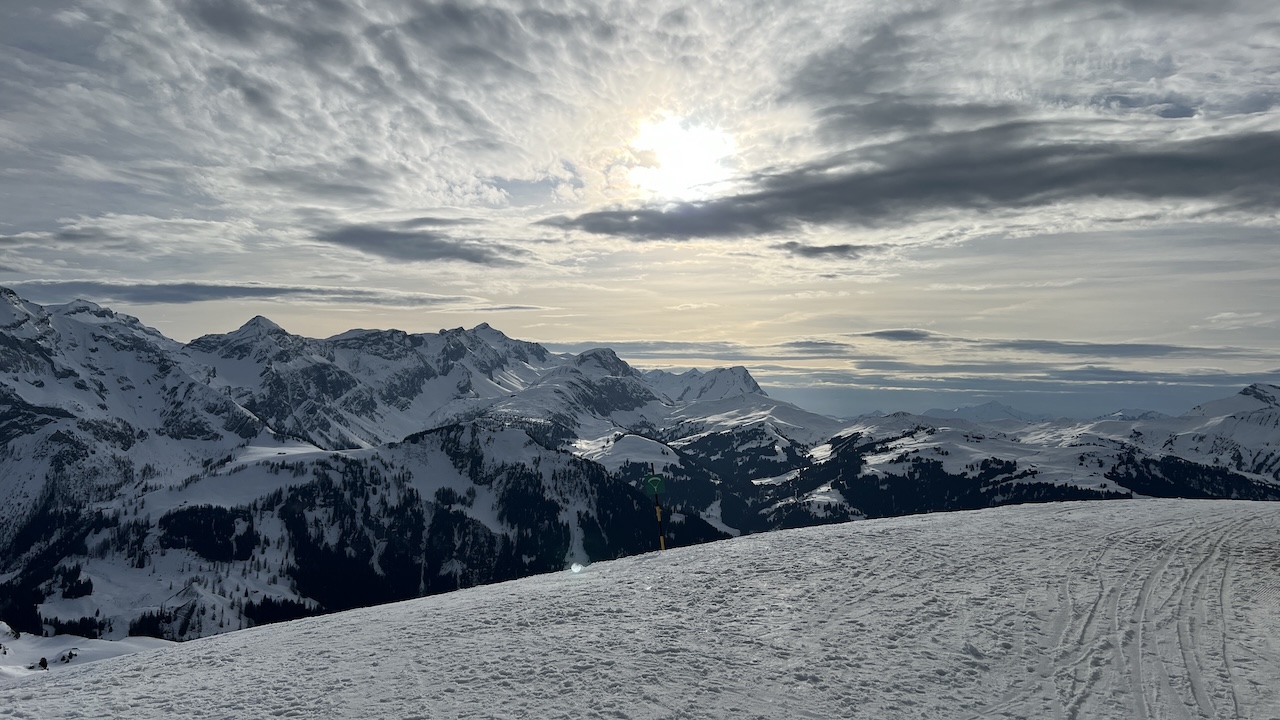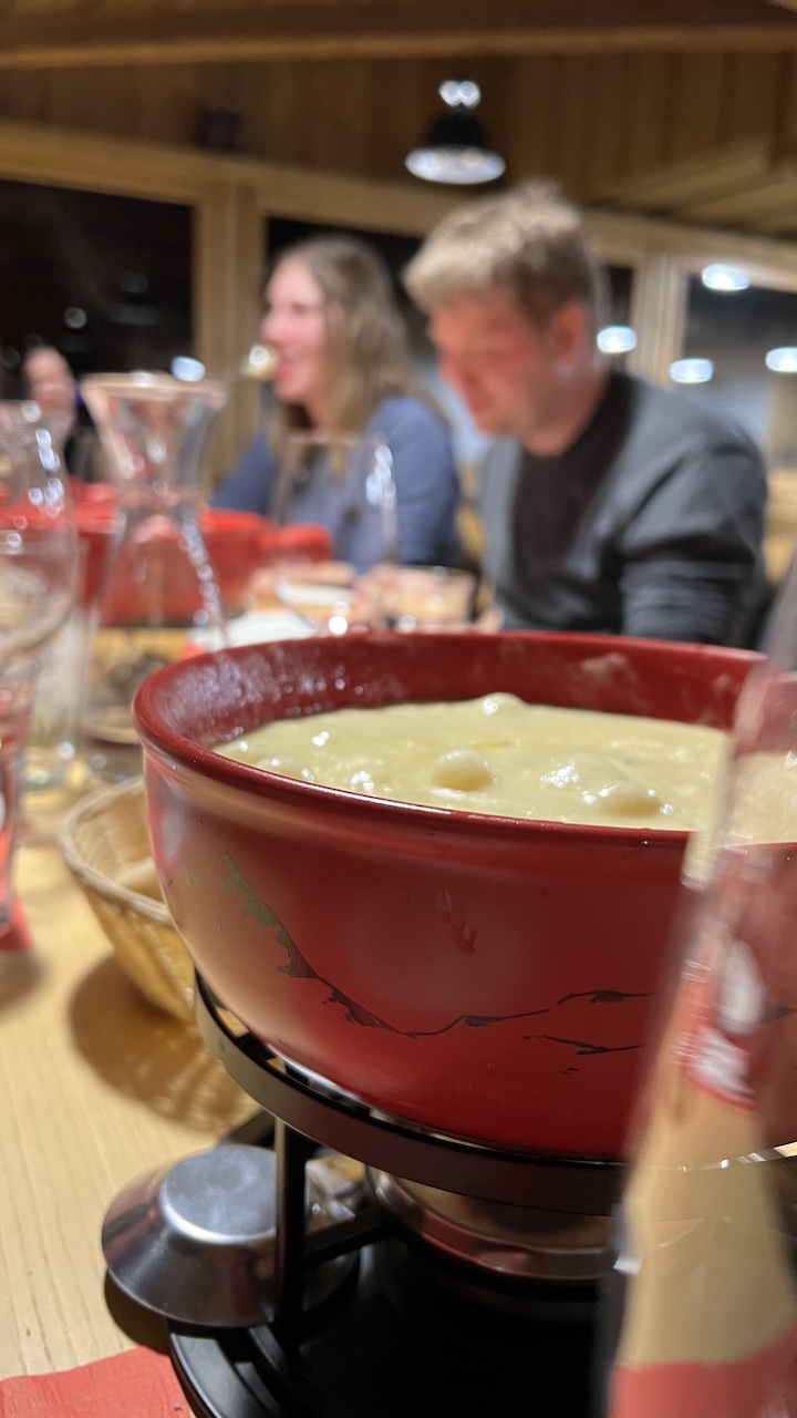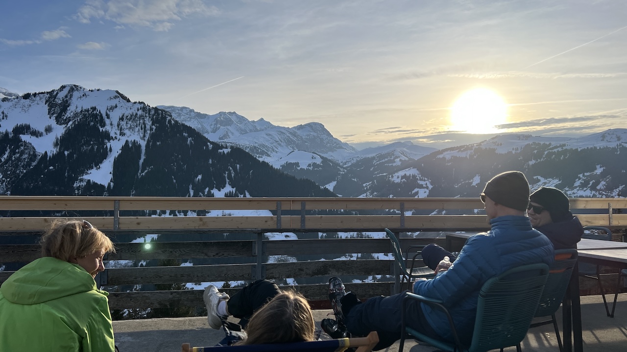 Bei unserer letzte Abfahrt zur Unterkunft, durften wir dann ein tolles Bergpanorama mit dem beginnenden Sonnenuntergang geniessen. Wir hatten den Tag genossen und durften uns auf der Terrasse weiter von den letzten Sonnenstrahlen verwöhnen lassen, bevor es ein leckeres Käsefondue zum Abendessen gab. Fast alleine in unserer Unterkunft wurden wieder viele Geschichten erzählt, noch mehr zusammen gelacht und eine lange Runde UNO gespielt, bevor wir dann ausgepowert ins Bett gefallen sind.