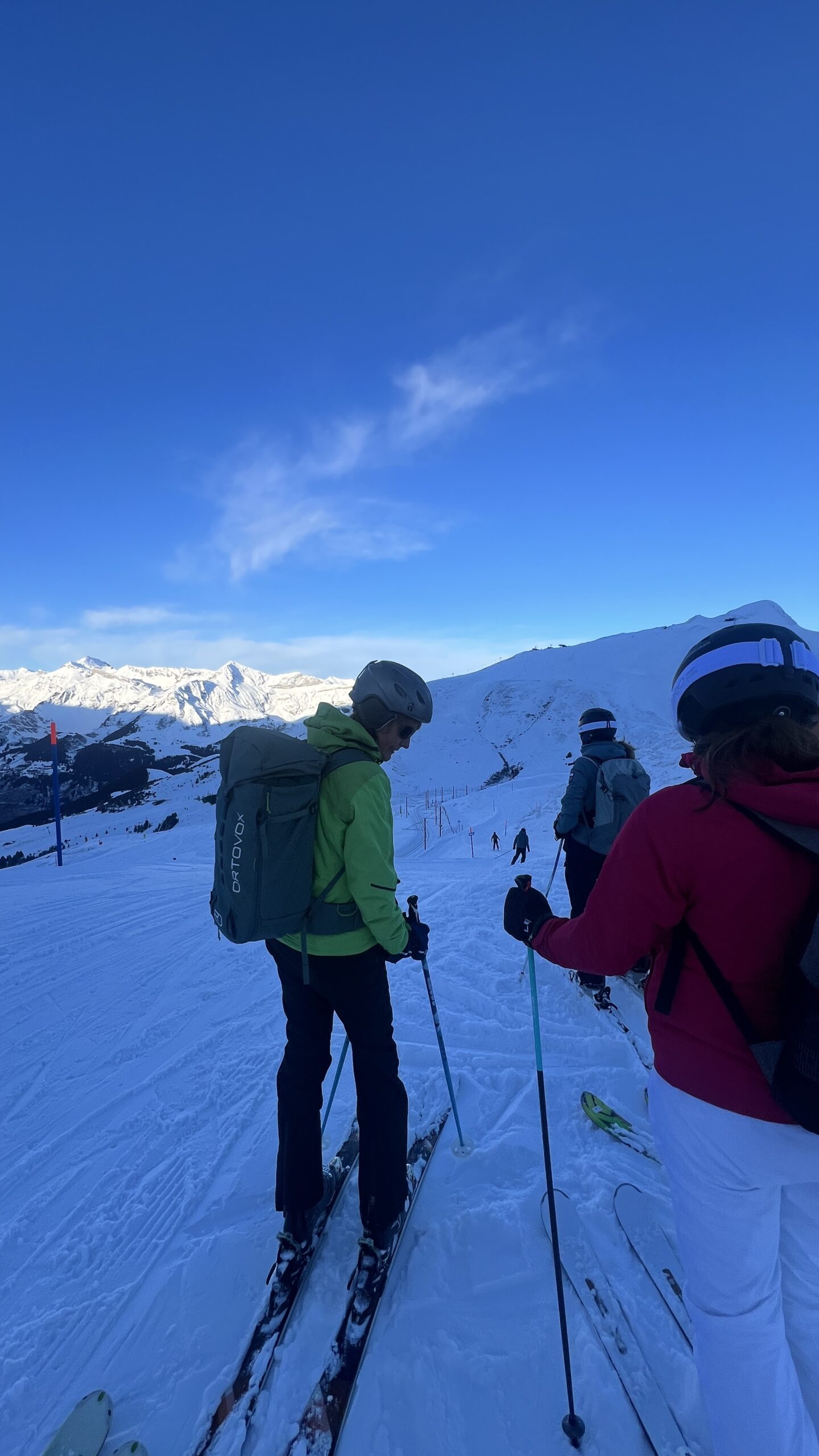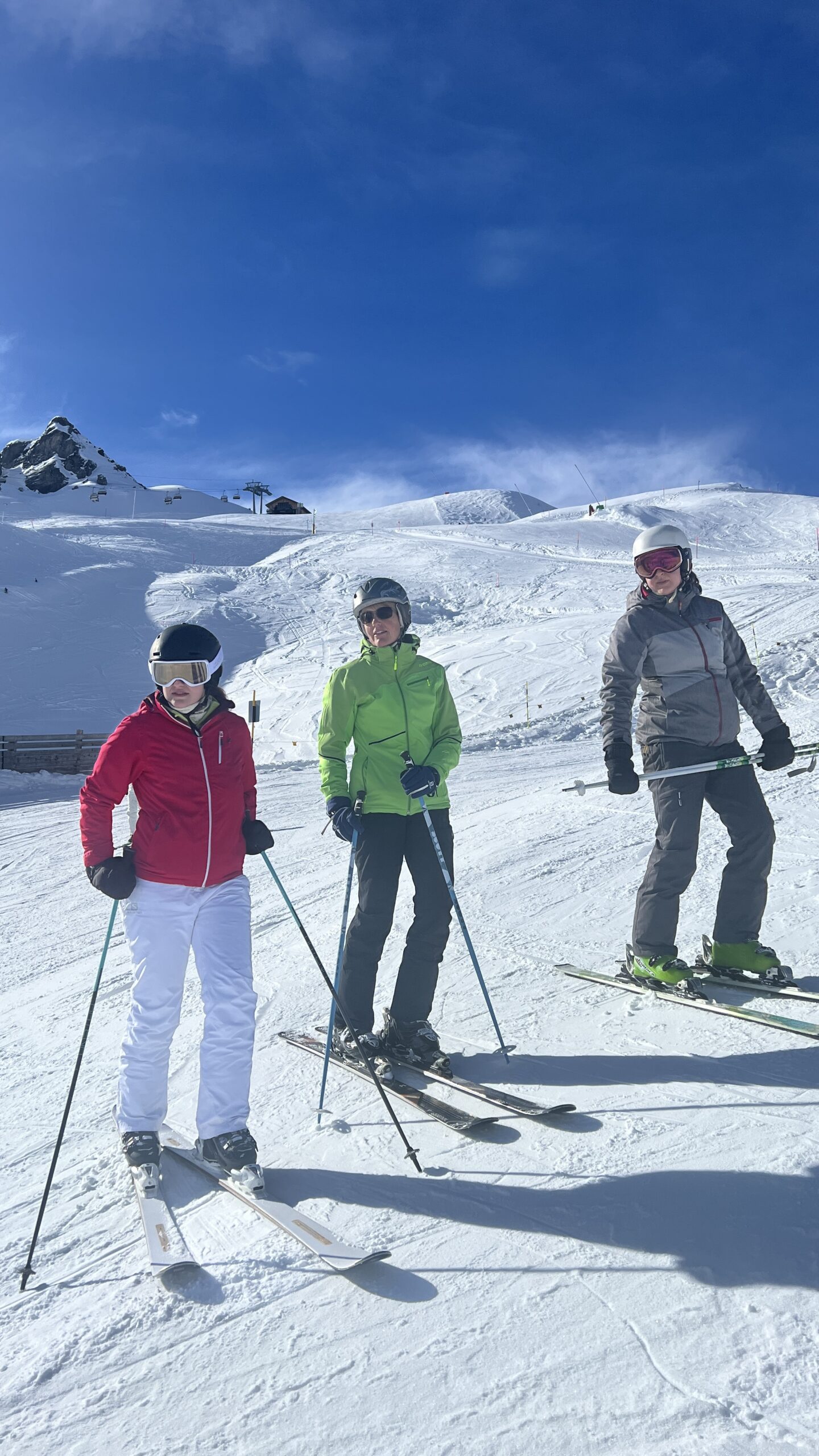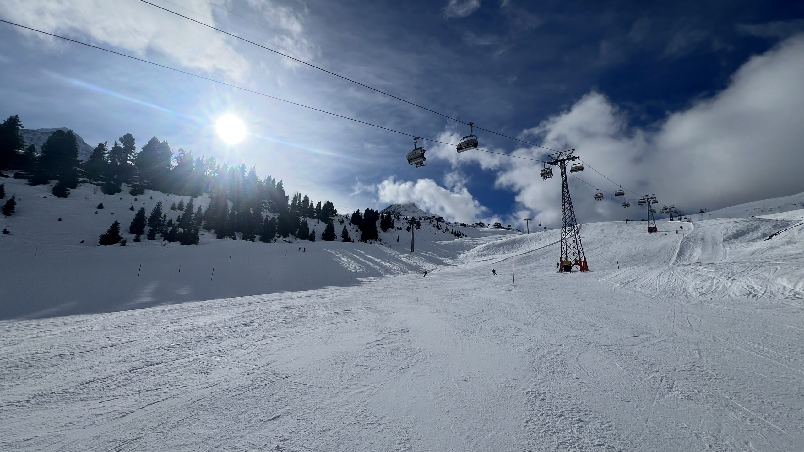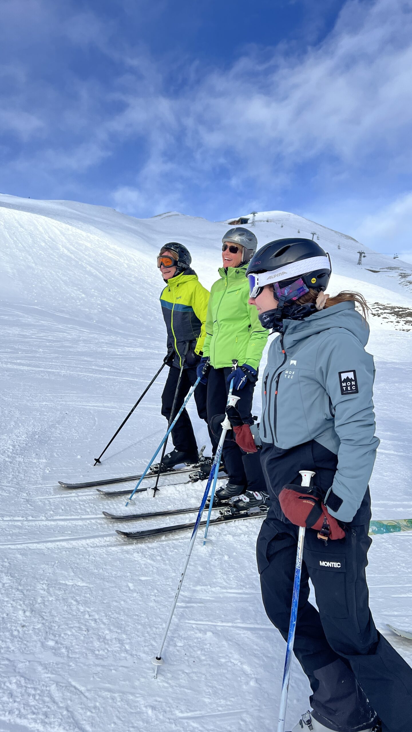 Bei nahezu idealen Pistenbedingungen, strahlend blauem Himmel und wenig Andrang, konnten wir frei fahren und mussten kaum anstehen. Mit viel Spass und Motivation zogen wir unsere Kurven und probierten auch Synchronfahren zu dritt für einen Moment aus 😉 alles gut dokumentiert durch viele Fotos und so manches Video.