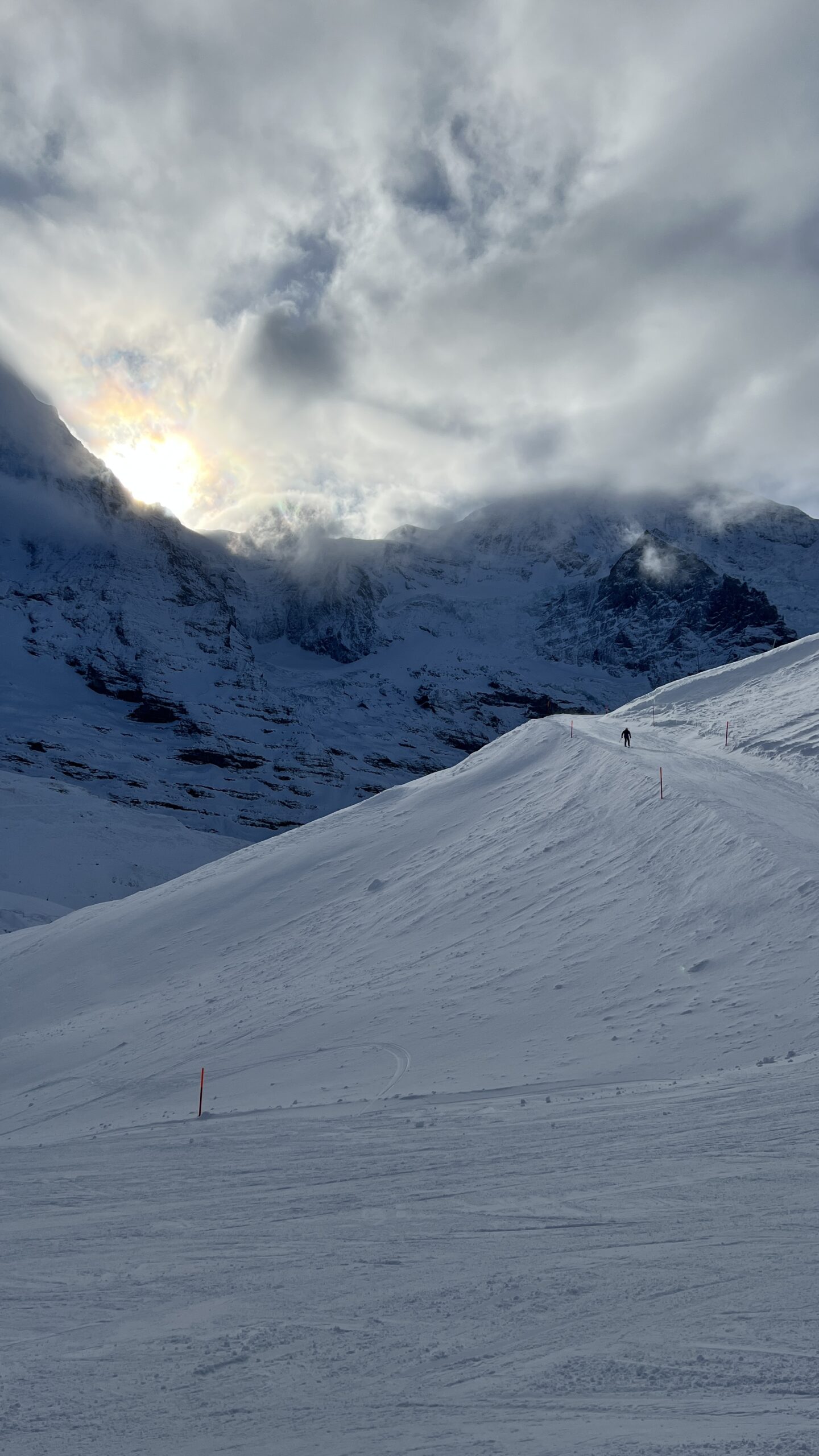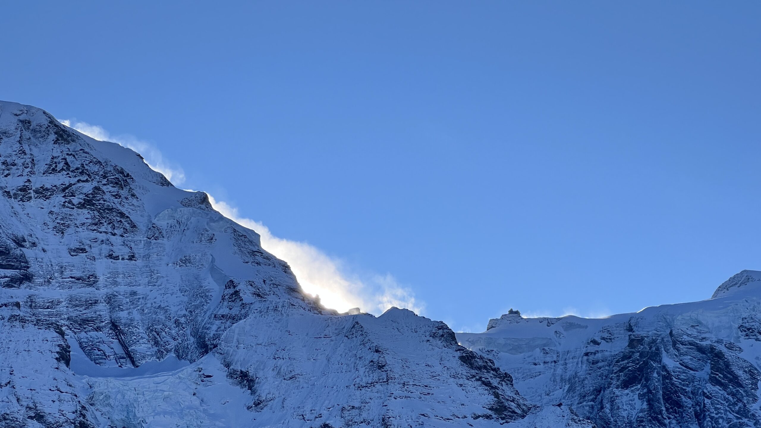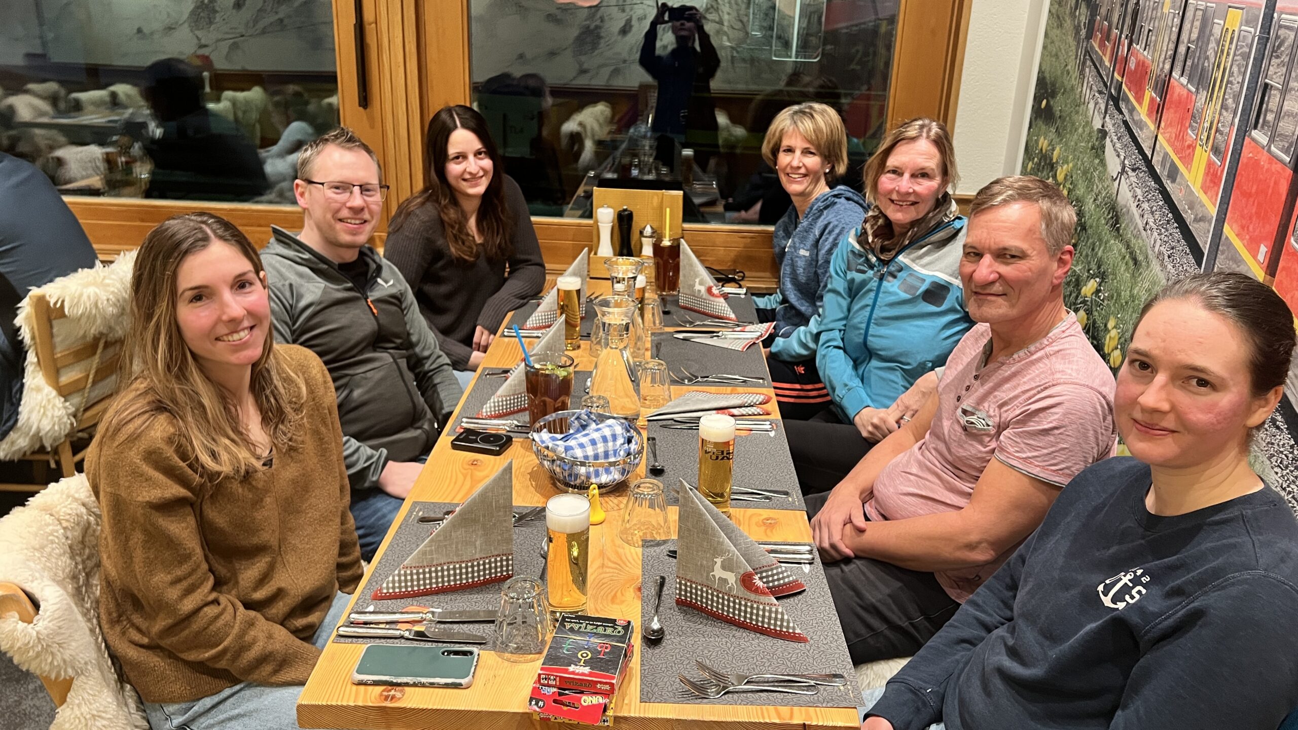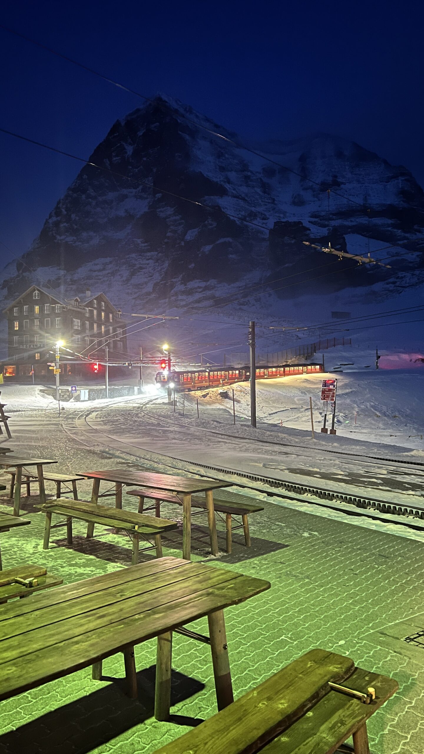 Mit der letzten Pistenkontrolle, kurz nach 16 Uhr, kehrten wir in unserer Unterkunft an der kleinen Scheidegg auf 2061m ein. Nach einer kurzen Pause ging es dann schon zum leckeren Abendessen mit Blick auf Eiger, Mönch und Jungfrau und den aufziehenden Sturm, der den lockeren Schnee umher gepustet hatte. Im warmen sitzend, spielten wir noch etwas UNO. Die letzte Runde zog sich dann aber über fast 1.5h und die Cremeschnitte musste deshalb noch etwas länger auf ihren Einsatz warten, fand dann aber doch ihren Weg zu uns.