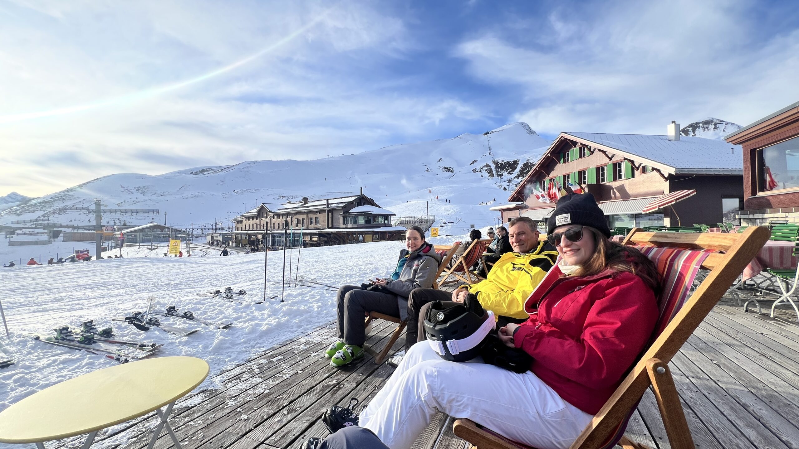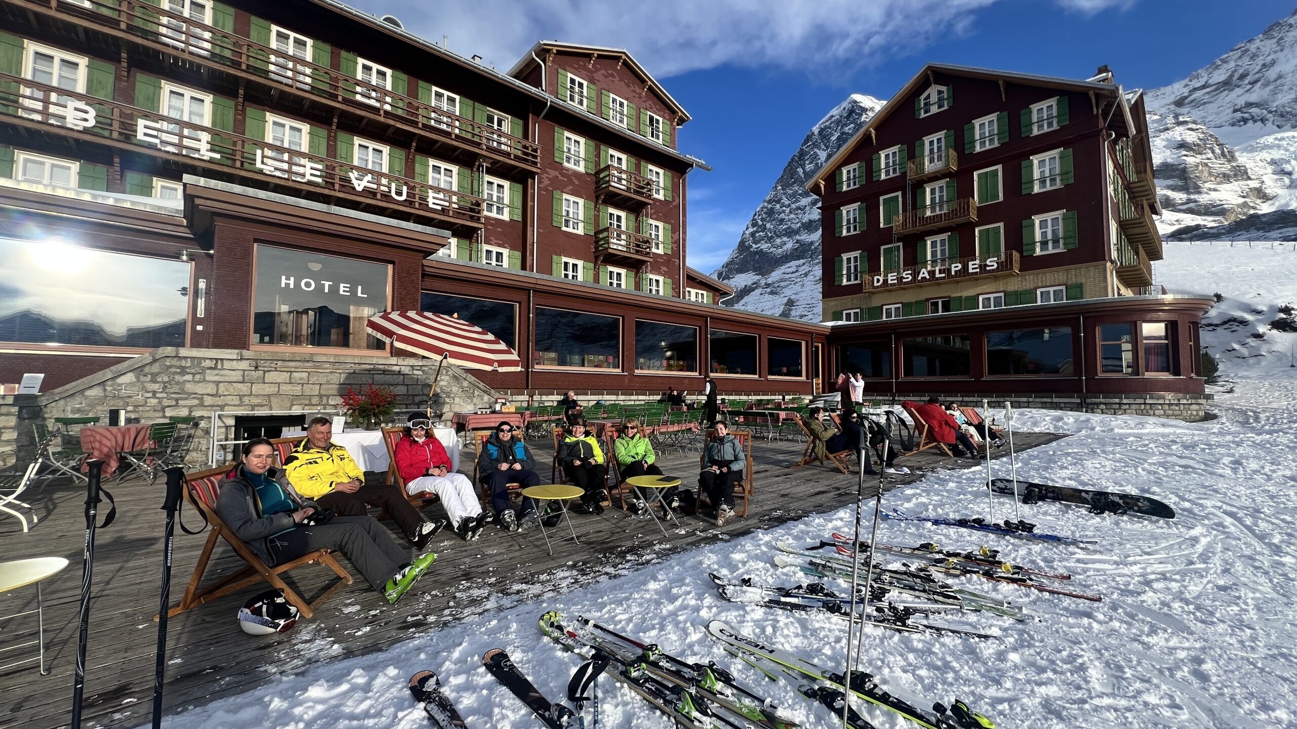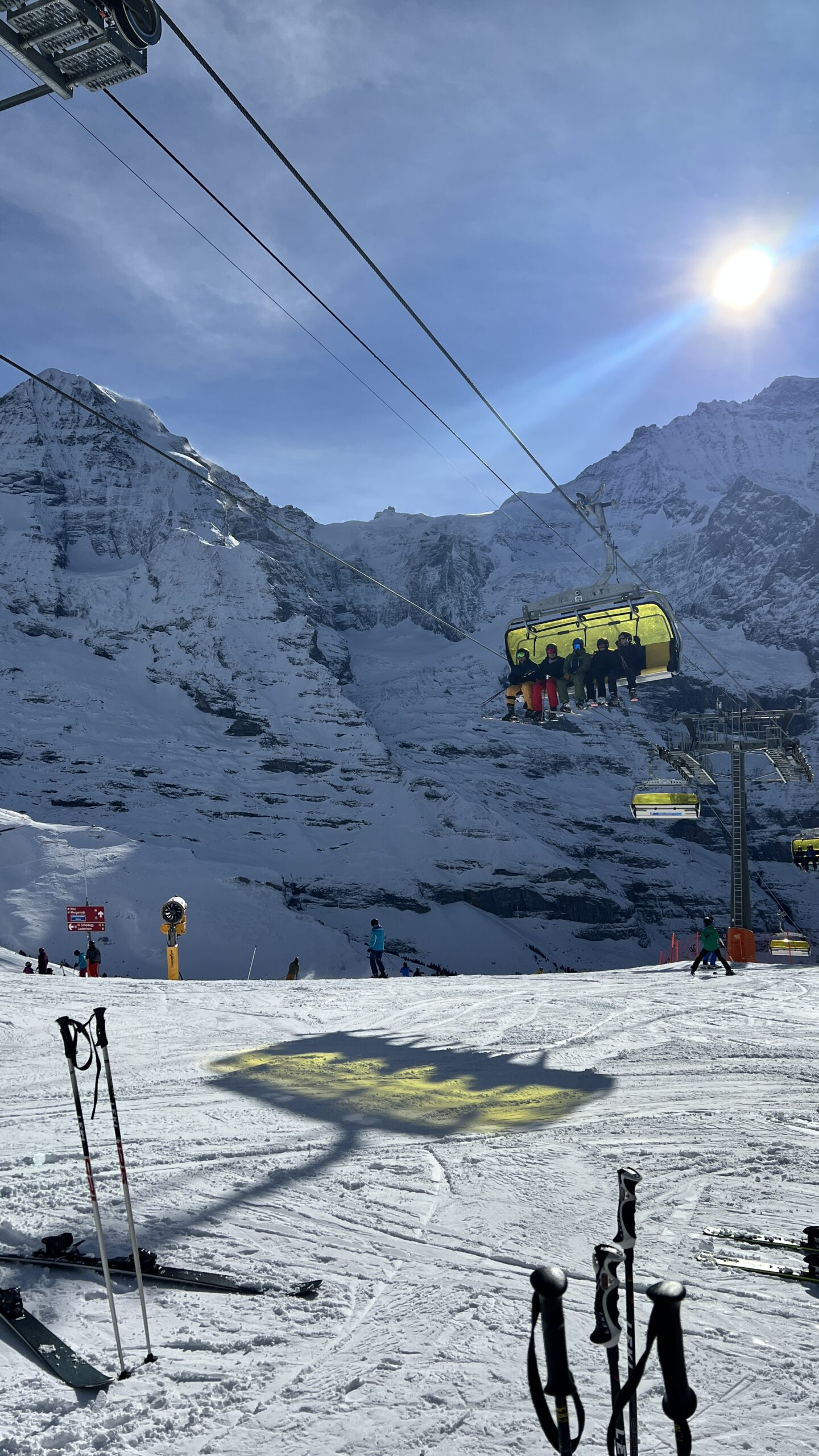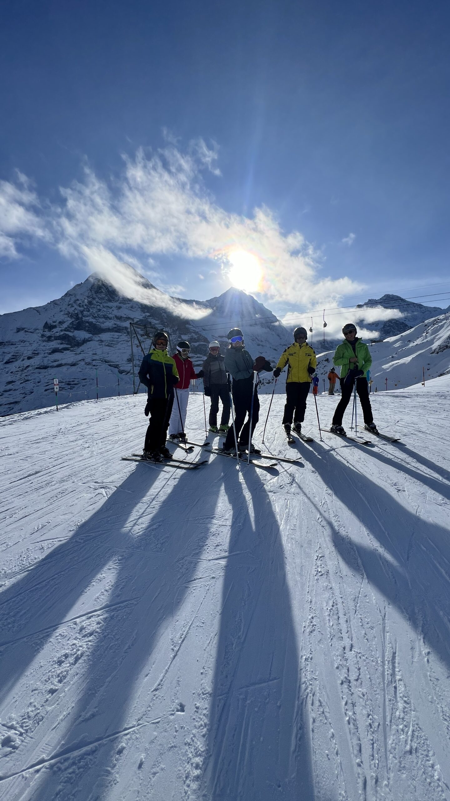 Schon auf dem Weg zur Bergstation Eigergletscher wurde die Sonnencreme ausgepackt und wir freuten uns an den Bergen und ausreichend Schnee. Unsere erste Fahrt ging zur Unterkunft „Lodge kl. Scheidegg“, wo wir unsere Rucksäcke und Taschen zwischenlagern konnten. Nun ging es von einer Piste zur anderen und wir konnten einige Kilometer fahren. Zwischendurch gab es eine kleine Kaffeepause und später ein, für unsere Verhältnisse, eher spätes Mittagessen. Immer dabei, die gute Laune, unsere Sonnenbrillen und eine Sonnenhungrige Regula. 😉